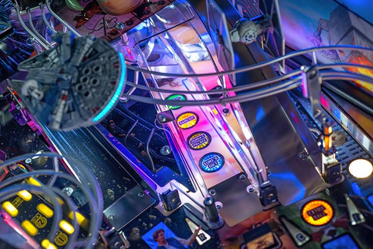 The Star Wars: Fall of the Empire pinball games launch on Stern’s next-generation SPIKE 3 technology platform, which includes a larger 18.5” full HD display with true color depth, along with a more powerful processor, and a new immersive audio system. SPIKE 3 electronics also feature more efficient power handling, improved Wi-Fi support, and wireless headphone capabilities.